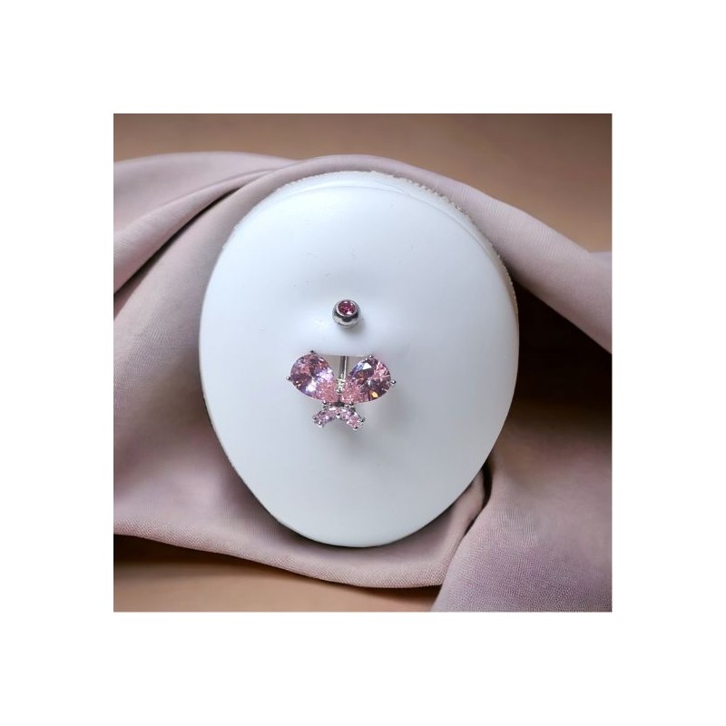 Piercing pour le nombril banane en forme de papillon en zirconium blanc ou rose, tige en acier chirurgical, longueur 10mm, épaisseur 1,6mm.