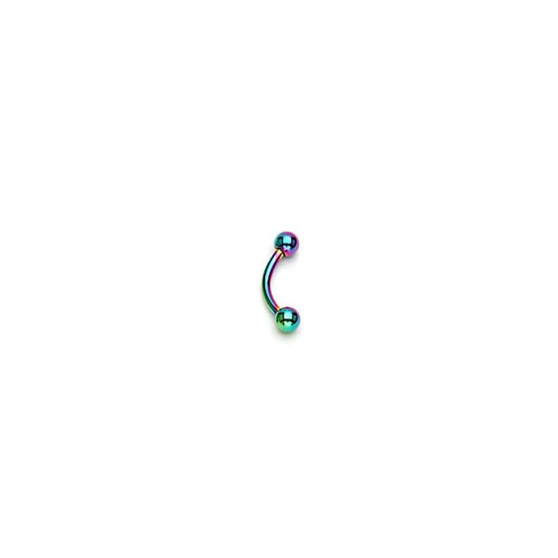 Piercing arcade acier anodisé arc en ciel. Longueur de tige 10mm, épaisseur de tige 1,6 mm avec deux boules de 4mm de diamètre.