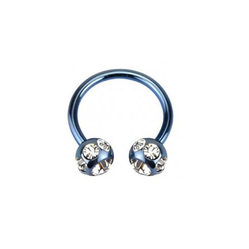 Fer à cheval en acier anodisé bleu terminé par 2 boules de 4mm avec 5 zirconiums blancs.